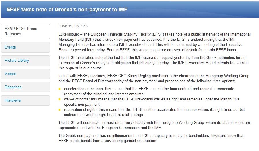 Ο EFSF αναφέρει πως λαμβάνει υπόψη το γεγονός ότι το ΔΝΤ έλαβε αίτημα χθες (30/06/2015) από τις ελληνικές αρχές για την επέκταση της υποχρέωσης αποπληρωμής από την Ελλάδα των δόσεων τις οποίες κατέστησαν απαιτητές.