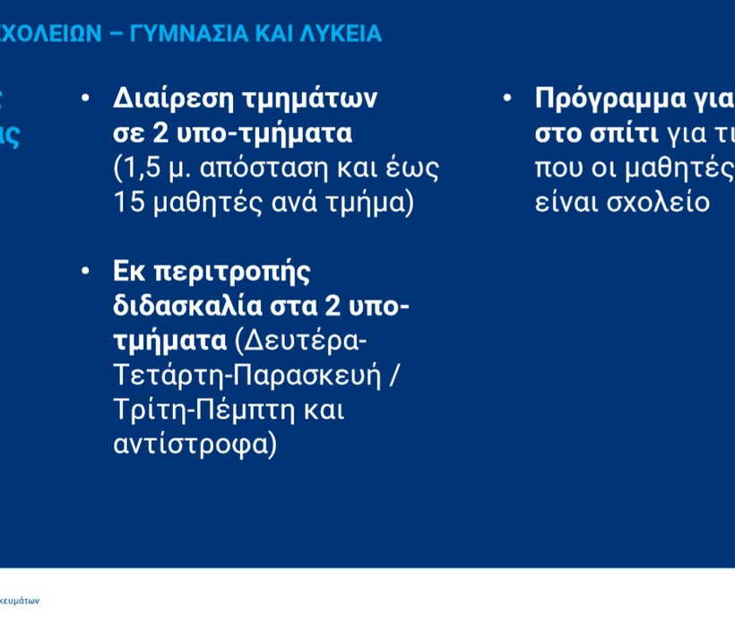 - Εκ περιτροπής διδασκαλία στα δύο υπο-τμήματα. Δευτέρα – Τετάρτη – Παρασκευή θα πηγαίνει σχολείο το μισό τμήμα και Τρίτη – Πέμπτη το άλλο μισό, ενώ την επόμενη εβδομάδα θα γίνεται το αντίστροφο. Τα ολιγομελή τμήματα (ως 15 άτομα) θα μπορούν να λειτουργούν καθημερινά.