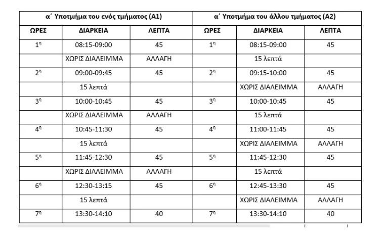 Προτείνεται η υιοθέτηση του ακόλουθου ωραρίου διαλειμμάτων για κάθε υποτμήμα εκάστου τμήματος.
