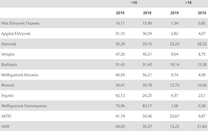 Σύμφωνα με τον έμπειρο εκπαιδευτικό αναλυτή, «τα παραδοσιακά δύσκολα μαθήματα είναι τα Αρχαία Ελληνικά, η Ιστορία, τα Μαθηματικά, η Φυσική. Στα Αρχαία Ελληνικά το ποσοστό των υποψηφίων που γράφουν κάτω από τη βάση ήταν στις Πανελλαδικές του 2019 το 31,72%, λίγο μικρότερο από το ποσοστό του 2018, όπως βλέπουμε στον πίνακα (σ.σ. παρακάτω). Το ποσοστό των υποψηφίων που αριστεύουν στα Αρχαία Ελληνικά είναι πάντα κάτω από 5%. Το 2019 ήταν μόλις το 2,82% των υποψηφίων. Η δυσκολία επίτευξης υψηλής βαθμολογίας στα Αρχαία Ελληνικά δείχνει τη δυσκολία του μαθήματος» υπογραμμίζει και προσθέτει: