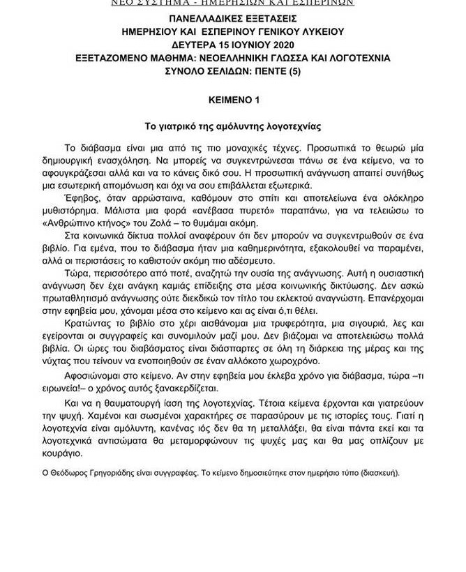 Τη σχέση τους με την ανάγνωση βιβλίων και τον ρόλο της στη γενικότερη διαχείριση του προσωπικού τους χρόνου, κλήθηκαν σήμερα να αναπτύξουν οι υποψήφιοι των Πανελλαδικών Εξετάσεων, εξεταζόμενοι στο μάθημα της Νεοελληνικής Γλώσσας και Λογοτεχνίας.