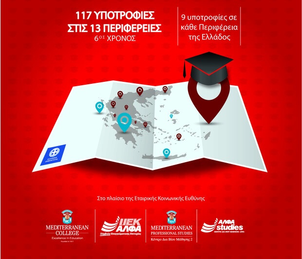 Τον πρωτοποριακό θεσμό «Υποτροφίες στις Περιφέρειες» που στέφθηκε πανελλαδικά με μεγάλη επιτυχία, για νέες και νέους που επιθυμούν να σπουδάσουν αλλά δεν έχουν την οικονομική δυνατότητα, συνεχίζει για 6η χρονιά φέτος το Mediterranean College Aθήνας και Θεσσαλονίκης και το ΙΕΚ ΑΛΦΑ Αθήνας, Πειραιά, Γλυφάδας και Θεσσαλονίκης, σε συνεργασία με τις 13 Περιφέρειες της χώρας μας.