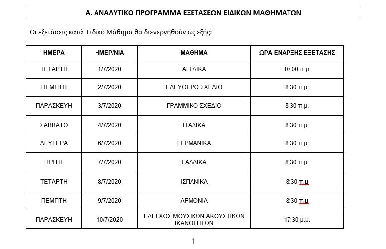 - Οι υποψήφιοι πρέπει να προσέρχονται στις αίθουσες εξέτασης μέχρι τις 08.00 π.μ. για όλα τα ειδικά μαθήματα, εκτός των Αγγλικών για το οποίο πρέπει να προσέλθουν μέχρι τις 09:30 π.μ., και του Έλεγχου Μουσικών Ακουστικών Ικανοτήτων για το οποίο πρέπει να προσέλθουν μέχρι τις 17:00 μ.μ.