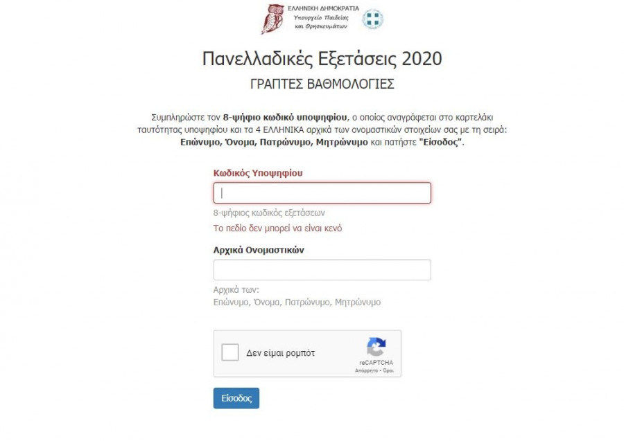 Οι υποψήφιοι μπαίνοντας στην διεύθυνση http://results.it.minedu.gov.gr και αφού πληκτρολογήσουν: