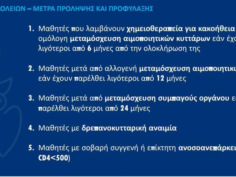 - Μαθητές με σοβαρή συγγενή ή επίκτητη ανοσοανεπάρκεια (HIV και CD4<500)