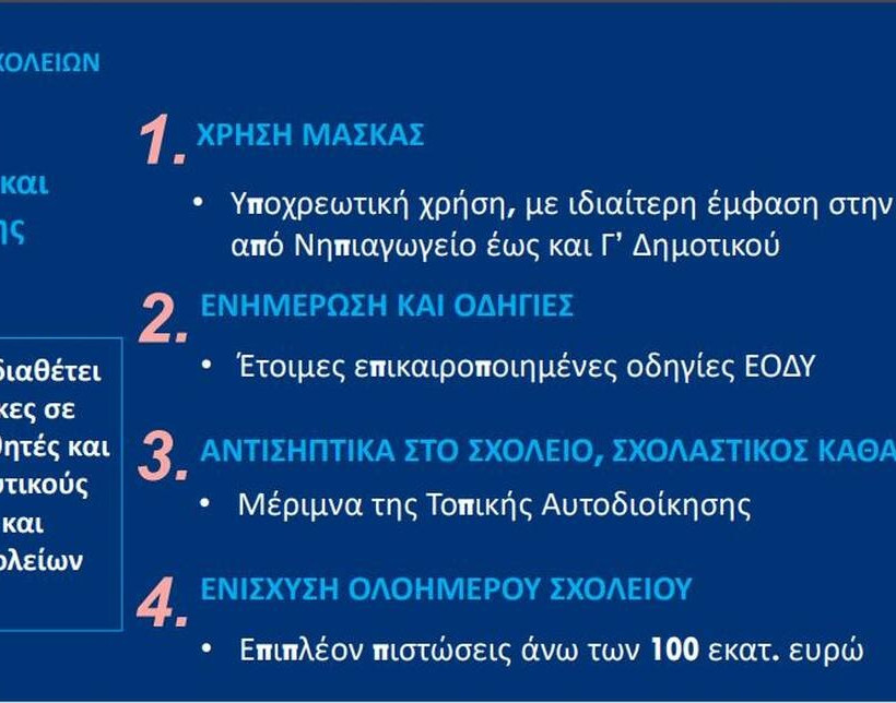 Κορονοϊός: Η χρήση μάσκας θα είναι υποχρεωτική για τους μαθητές από το Νηπιαγωγείο. Η Κυβέρνηση διαθέτει δωρεάν μάσκες σε όλους τους μαθητές και τους εκπαιδευτικούς, δημοσίων και ιδιωτικών σχολείων.
