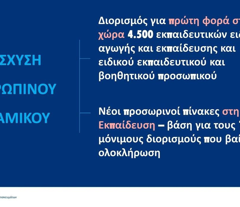 - Ολοκληρώθηκαν οι 4.500 μόνιμοι διορισμοί εκπαιδευτικών και ειδικού εκπαιδευτικού και βοηθητικού προσωπικού στην Ειδική Αγωγή και Εκπαίδευση.