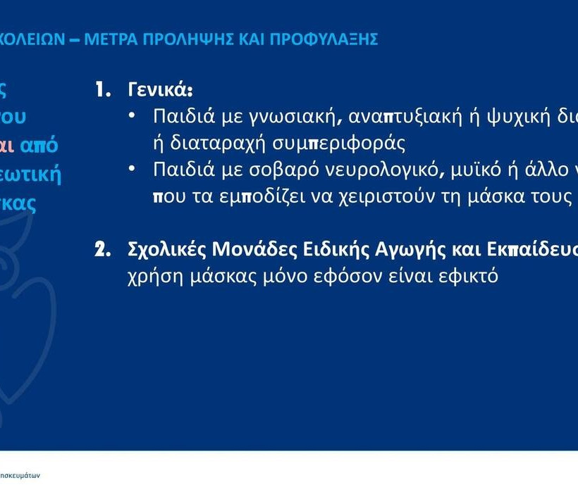 - Στα σχολεία Ειδικής Αγωγής και Εκπαίδευσης, προβλέπεται η χρήση μάσκας μόνο εφόσον είναι εφικτό