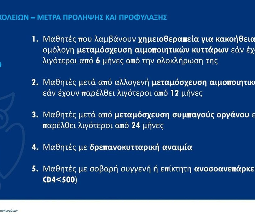 - Μαθητές με σοβαρή συγγενή ή επίκτητη ανοσοανεπάρκεια (HIV και CD4<500)