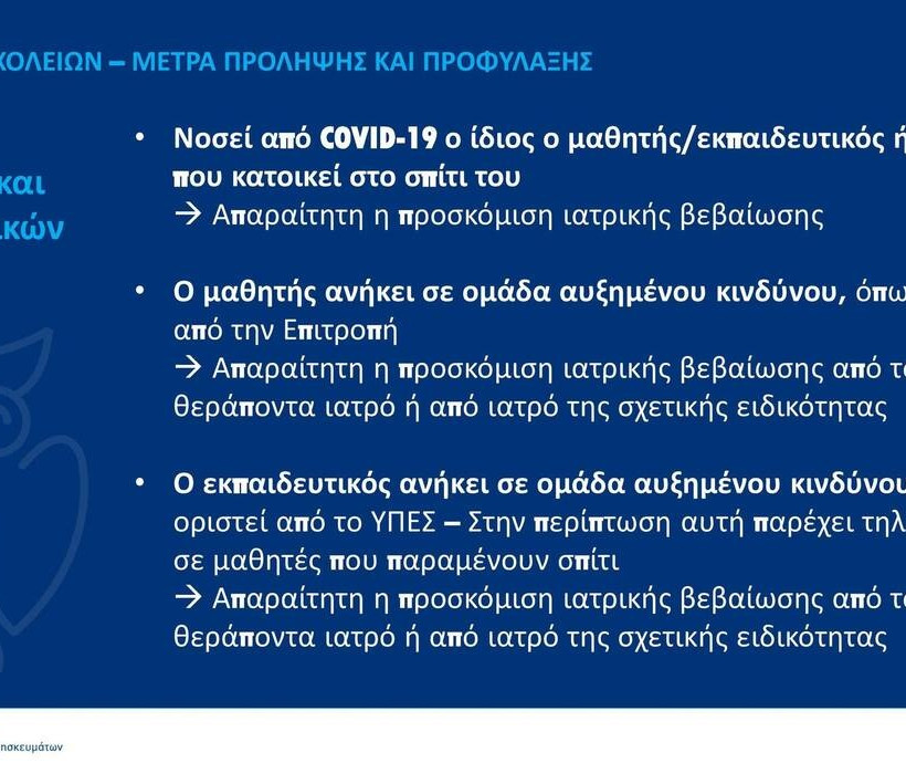 - Εάν νοσεί από κορονοϊό ο ίδιος ο μαθητής/εκπαιδευτικός ή κάποιος που κατοικεί στο σπίτι του. Είναι απαραίτητη η προσκόμιση ιατρικής βεβαίωσης