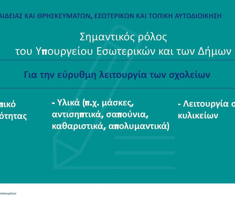 3) Θα διανεμηθούν, με μέριμνα της Τοπικής Αυτοδιοίκησης, αντισηπτικά στα σχολεία, και προβλέπεται σχολαστικός καθαρισμός και κατά τη διάρκεια λειτουργίας των σχολείων και μετά το πέρας αυτής.