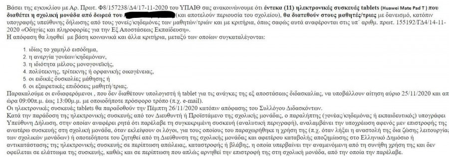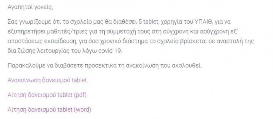 Κι όμως το περιστατικό δεν είναι μεμονωμένο. Από άλλο σχολείο της ευρύτερης περιοχής του Πειραιά μας έστειλαν την ανακοίνωση ότι για διακόσια παιδιά δίδονται 11 τάμπλετ για οικογένειες που έχουν προβλήματα και δεν διαθέτουν ηλεκτρονικό εξοπλισμό.