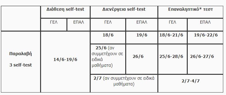 Οι ημερομηνίες για την προμήθεια και διενέργεια των αυτοδιαγνωστικών, αλλά και επαναληπτικών τεστ, παρατίθενται στον παρακάτω πίνακα: