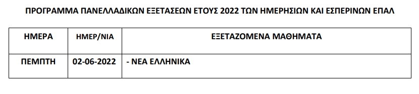 Το διάστημα 3 - 10 Ιουνίου θα εξεταστούν οι υποψήφιοι των Γενικών Λυκείων και από 2 μέχρι 17 Ιουνίου των Επαγγελματικών Λυκείων. Η αρχή των Πανελλαδικών Εξετάσεων 2022 γίνεται με το μάθημα των Νέων Ελληνικών για τους μαθητές των ΕΠΑΛ την Πέμπτη 2 Ιουνίου.
