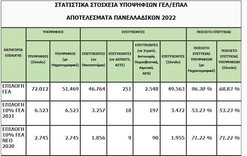 O συνολικός αριθμός των υποψηφίων με οριστικοποιημένο παράλληλο μηχανογραφικό φέτος ανήλθε σε 20.432, εκ των οποίων 18.812 υποψήφιοι είναι απόφοιτοι Λυκείων σχολικού έτους 2021-2022, ενώ 1.620 είναι απόφοιτοι παλαιότερων ετών. Επίσης, 157 υποψήφιοι επιλέχθηκαν στην ειδική κατηγορία, ενώ 20.275 επιλέχθηκαν στη γενική κατηγορία.