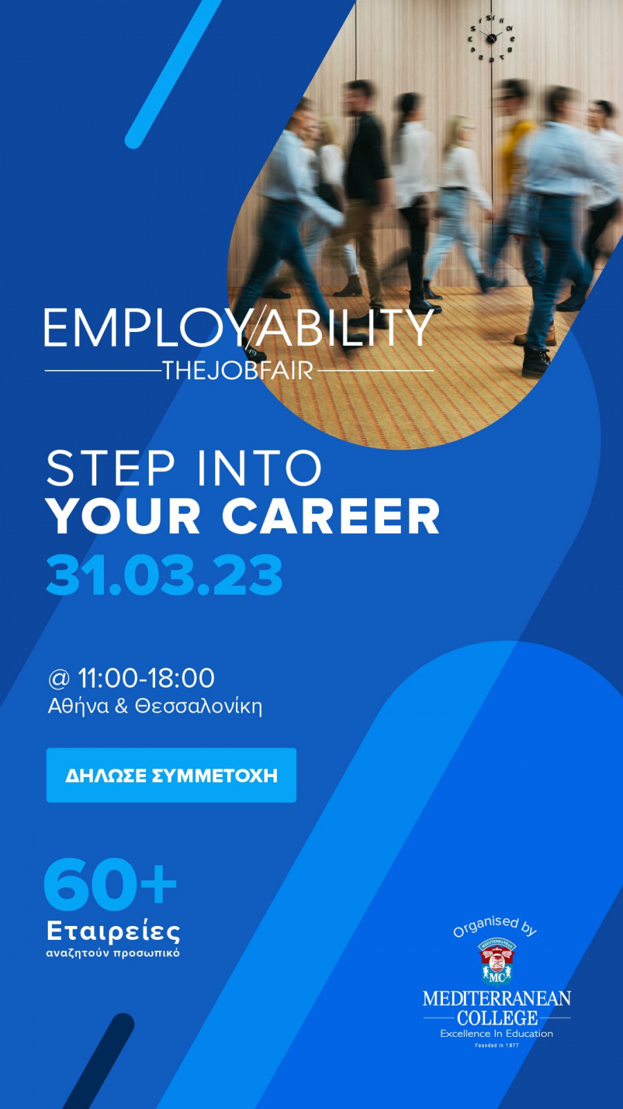 Με σύνθημα “Step into your Career”, εκπρόσωποι από τα HR Depts. κορυφαίων επιχειρήσεων θα βρίσκονται στις εγκαταστάσεις του Κολλεγίου για να σου πάρουν συνέντευξη για πρόσληψη ή πρακτική άσκηση. Δήλωσε ΣΗΜΕΡΑ συμμετοχή στο Employability Fair 2023 του Mediterranean College και: