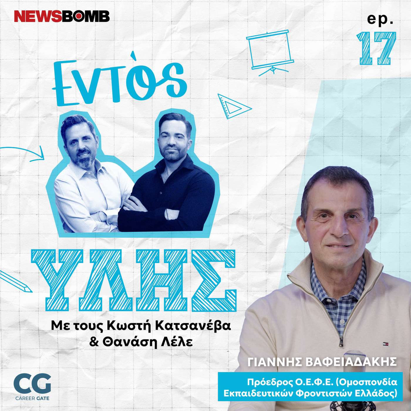 Ένα σύγχρονο, ενημερωτικό και ανθρώπινο video podcast για νέους, γονείς και επαγγελματίες που ψάχνουν τον δρόμο τους στην εκπαίδευση και την καριέρα. Με οικοδεσπότες τους συμβούλους επαγγελματικού προσανατολισμού του Career Gate, Κωστή Κατσανέβα και Θανάση Λέλε, κάθε επεισόδιο φωτίζει επιλογές, ανατρέπει στερεότυπα και προσφέρει πρακτικές συμβουλές για σπουδές, καριέρα και μέλλον.