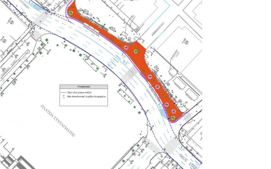 Συγκεκριμένα, στην πλατεία Συντάγματος οι παρεμβάσεις αφορούν στο οδικό τμήμα που συνδέει την οδό Σταδίου (διασταύρωση με Καραγιώργη Σερβίας) με την οδό Φιλελλήνων (διασταύρωση με Μητροπόλεως) όπου θα δημιουργηθεί νέος επιπλέον χώρος για πεζούς στη δεξιά πλευρά κυκλοφορίας.