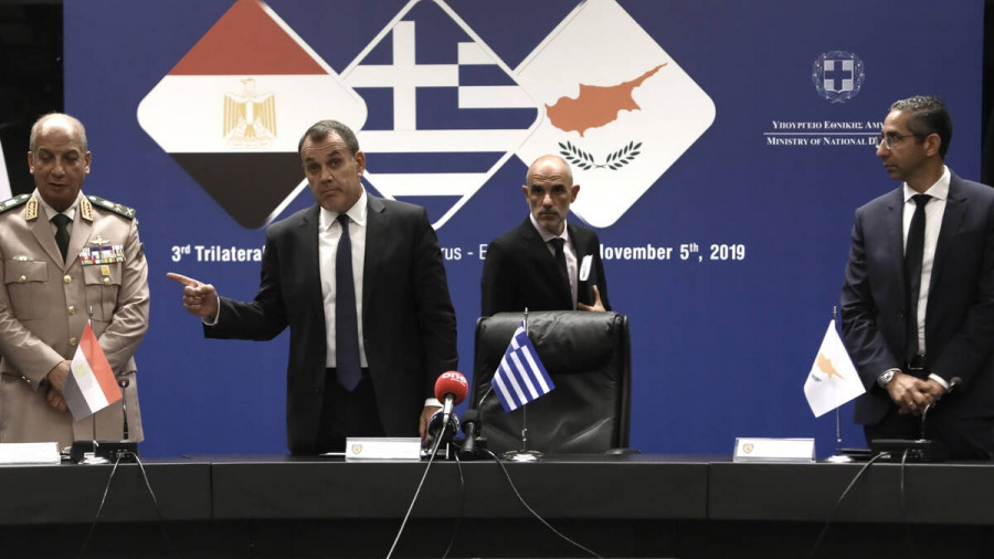 Τις παράνομες ενέργειες της Τουρκίας στην κυπριακή ΑΟΖ και στη θαλάσσια περιοχή της Κύπρου, την προκλητική συμπεριφορά της στο Αιγαίο με τις παραβιάσεις του εθνικού εναερίου χώρου και των χωρικών υδάτων, καθώς και την εισβολή της στην Συρία, καταδίκασαν οι υπουργοί Εθνικής Άμυνας Ελλάδας- Αιγύπτου και Κύπρου, Νικόλαος Παναγιωτόπουλος, Μωχάμεντ Αχμεντ Ζακί και Σάββας Αγγελίδης, με κοινή δήλωσή τους στο πλαίσιο της τριμερούς συνάντησης που πραγματοποιήθηκε στην Αθήνα.