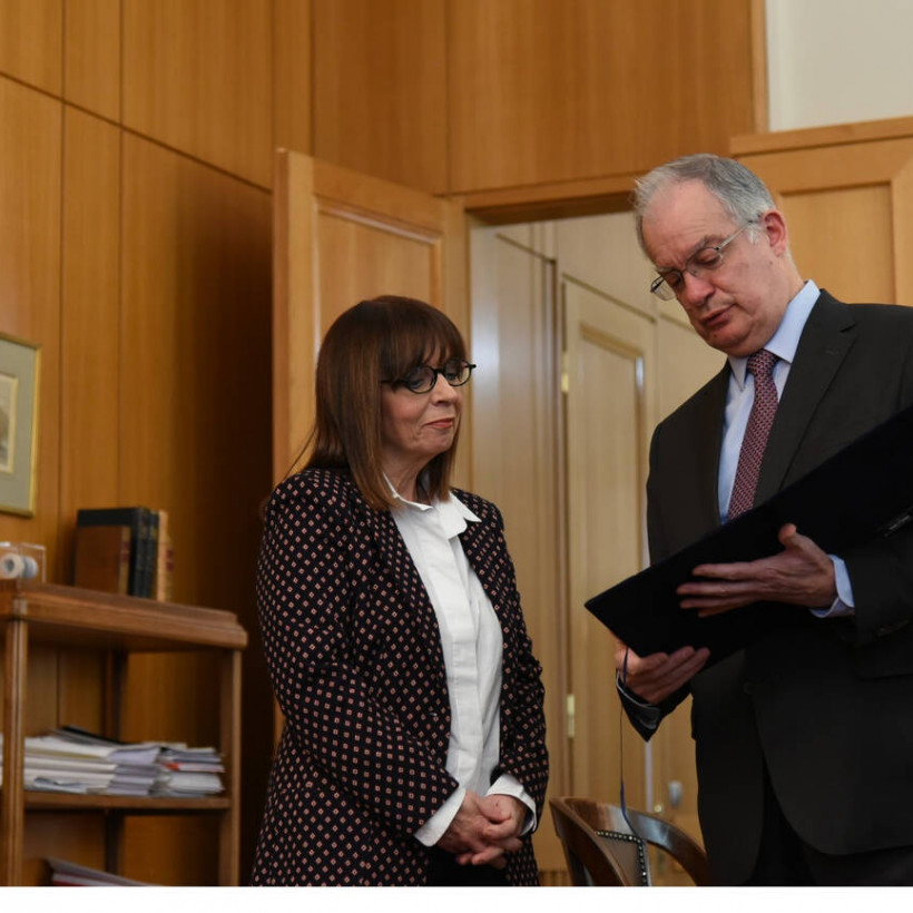 Ο κ. Τασούλας συνοδευόταν από το Προεδρείο της Βουλής ενώ διάβασε στη νέα Πρόεδρο της Δημοκρατίας την απόφαση για την εκλογή της.