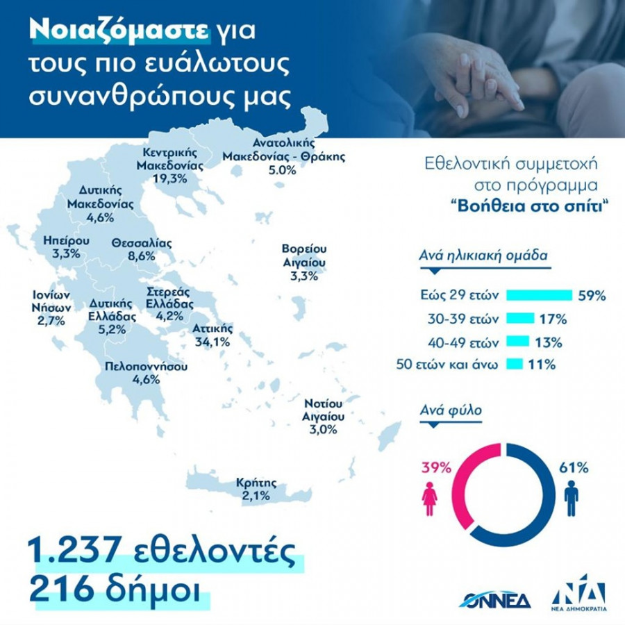 Μέσα στις δύο πρώτες μέρες από το κοινό κάλεσμα της Νέας Δημοκρατίας και της ΟΝΝΕΔ, ο κατάλογος των εθελοντών που δημιουργήθηκε στο site του κυβερνώντος κόμματος μετράει ήδη πάνω από 1.200 άτομα σε 216 Δήμους της χώρας, που επιθυμούν να συνεισφέρουν σ’ αυτήν την προσπάθεια και να στελεχώσουν το πρόγραμμα «Βοήθεια στο Σπίτι».