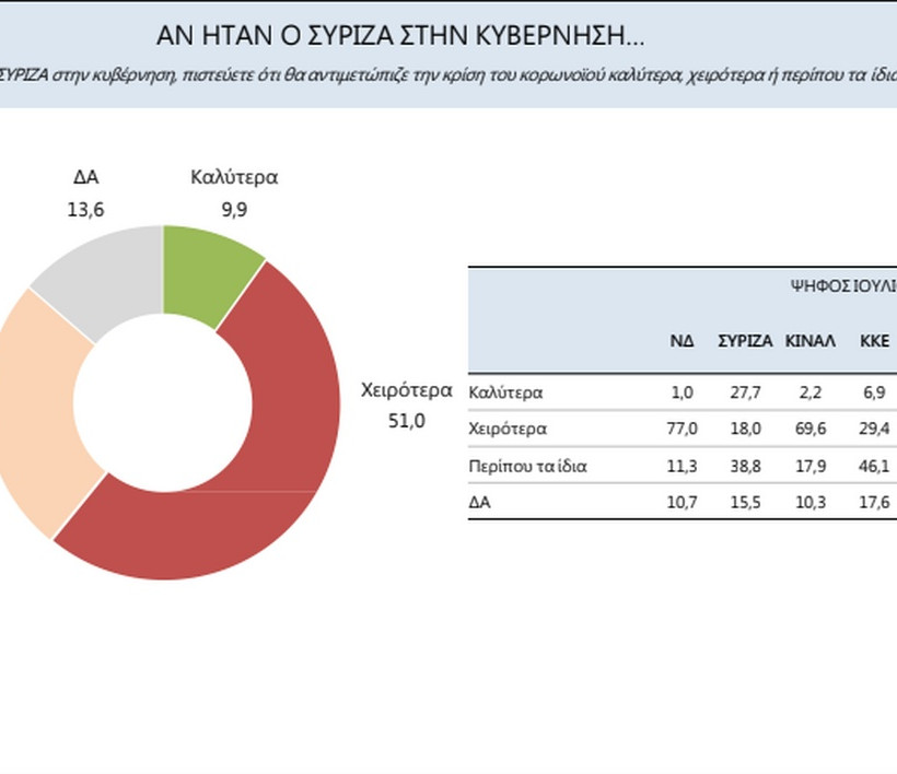 Μάλιστα, το 51% απαντά πως εάν ο ΣΥΡΙΖΑ ήταν κυβέρνηση τα πράγματα θα ήταν χειρότερα, το 25,5% απαντά πως τα πράγματα θα ήταν περίπου τα ίδια και το 9,9% καλύτερα.