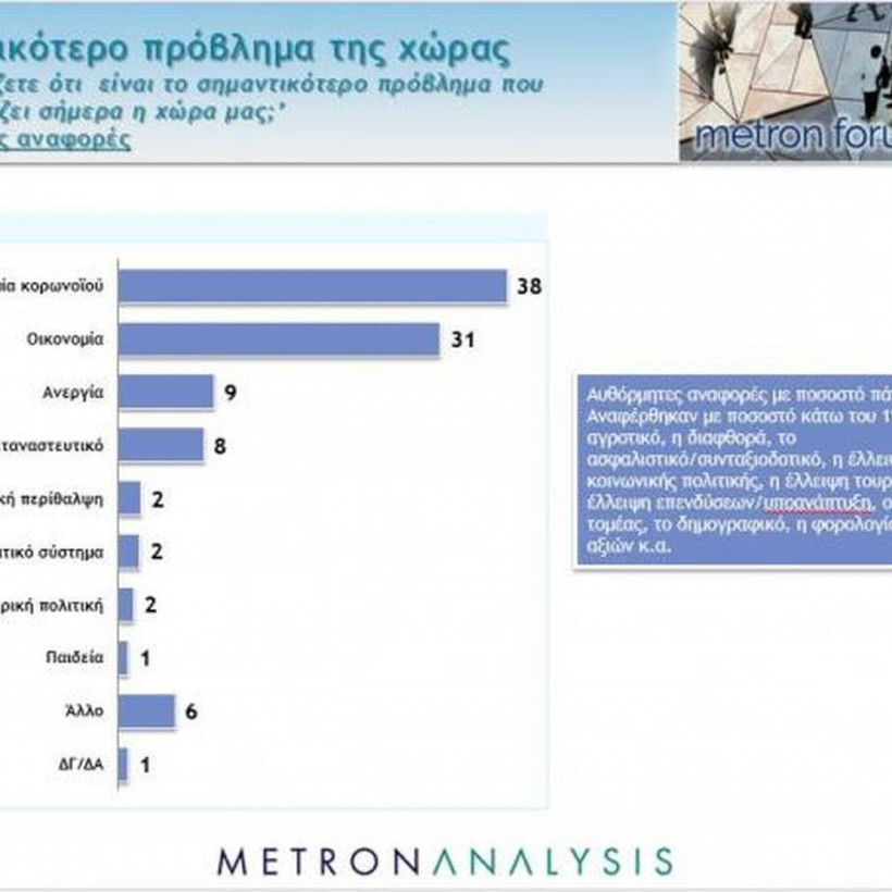 Στην ερώτηση για το ποιο πιστεύουν οι πολίτες ότι είναι το μεγαλύτερο πρόβλημα της χώρας, το 38% απαντά η επιδημία του κοροναϊού, το 31% η οικονομία, το 9% η ανεργία και το 8% το προσφυγικό/μεταναστευτικό.