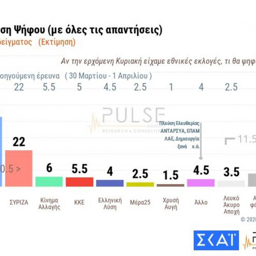 Μεγάλο προβάδισμα εξακολουθεί να καταγράφει η Νέα Δημοκρατία έναντι του ΣΥΡΙΖΑ (20,5 ποσοστιαίες μονάδες) σε νέα δημοσκόπηση της PULSE για τον τηλεοπτικό σταθμό ΣΚΑΪ. Την ίδια στιγμή, καταλληλότερος για πρωθυπουργός εμφανίζεται ο Κυριάκος Μητσοτάκης.