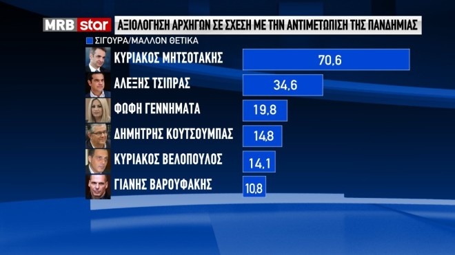 Στην αξιολόγηση των πολιτικών αρχηγών σε σχέση με την αντιμετώπιση της πανδημίας με 70,6% προηγείται ο Κυριάκος Μητσοτάκης και ακολουθεί ο Αλέξης Τσίπρας με 34,6%, η Φώφη Γεννηματά με 19,8%, ο Δ. Κουτσούμπας με 14,8%, ο Κ. Βελόπουλος με 14,1% και ο Γ. Βαρουφάκης με 10,8%.