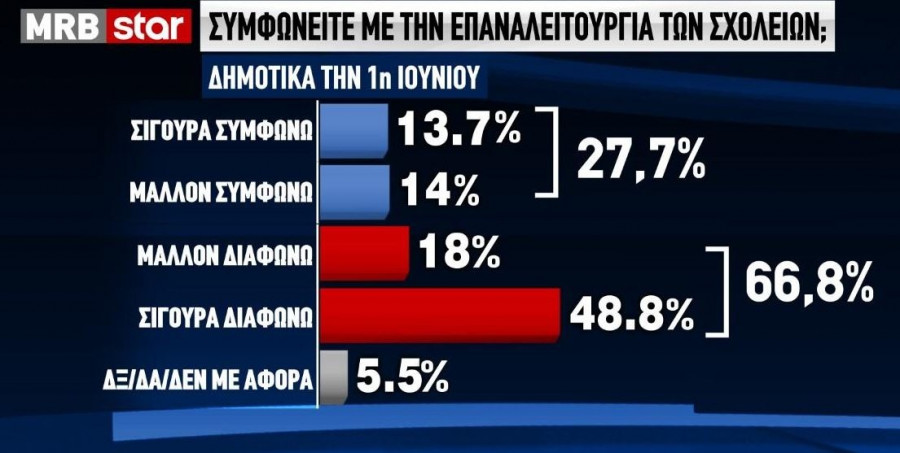 Την ίδια στιγμή, η συντριπτική πλειοψηφία – το 66,8%- διαφωνεί με το άνοιγμα των δημοτικών σχολείων. Το 27,7% συμφωνεί με το ενδεχόμενο ανοίγματος.