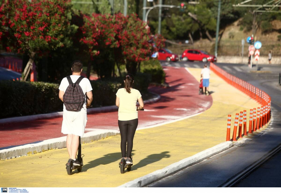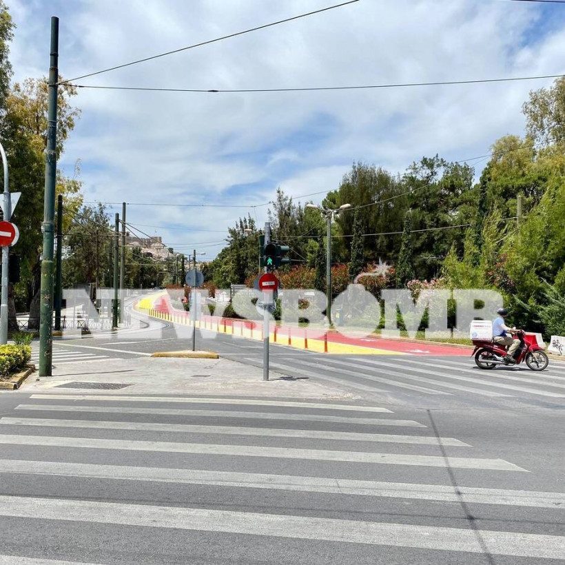 Δίπλα σε αυτόν, εκεί που περνούν οι γραμμές του τραμ, δημιουργήθηκε μια προσωρινή διαδρομή για ποδήλατο, σε κίτρινο χρώμα με αντανακλαστικές και αντιολισθητικές βαφές.
