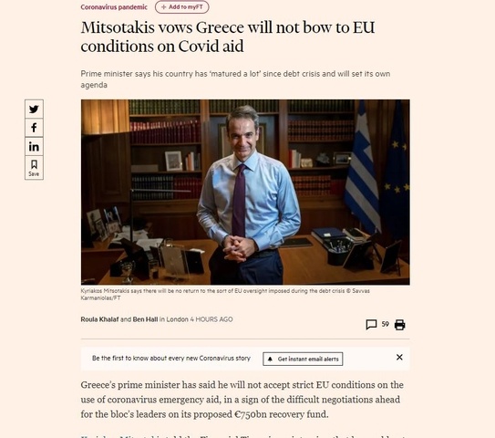 Μήνυμα ότι η Ελλάδα δεν θα δεχτεί αυστηρούς όρους για το Ευρωπαϊκό Ταμείο Ανάκαμψης του κορωνοϊού στέλνει ο πρωθυπουργός Κυριάκος Μητσοτάκης μέσω συνέντευξής του στους «Financial Times» -μια δήλωση που η οικονομική εφημερίδα ερμηνεύει ως «σημάδι» των δύσκολων διαπραγματεύσεων που αναμένονται το επόμενο διάστημα στο ευρωπαϊκό μπλοκ για την ενίσχυση 750 δισ. ευρώ.