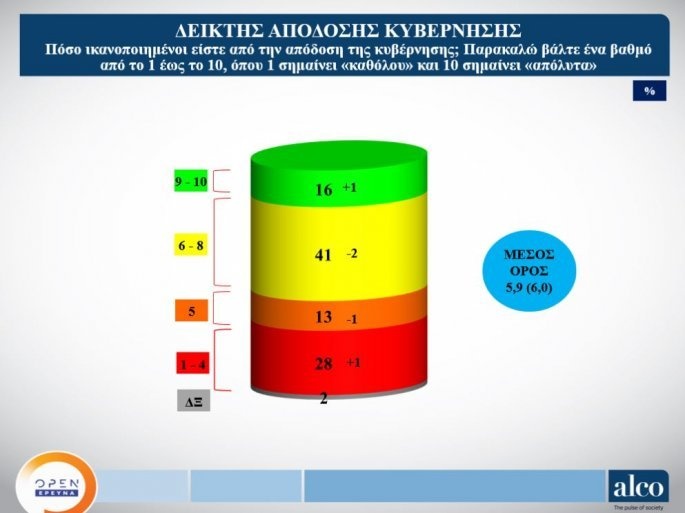 Όσον αφορά τον δείκτη βαθμολόγησης της κυβέρνησης το 28% απαντάει ότι δεν είναι καθόλου ικανοποιημένο και το 16% θεωρεί ότι είναι απόλυτα ικανοποιημένο από την κυβέρνηση.