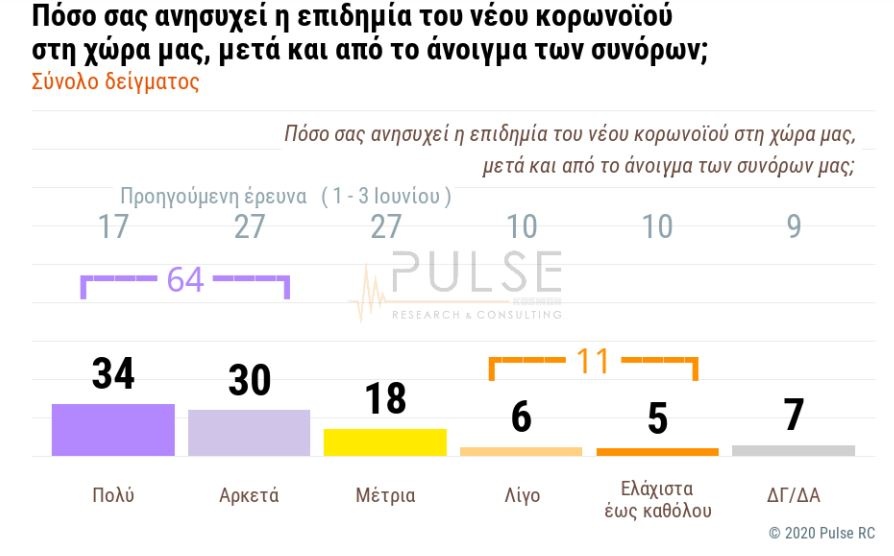 Έντονη είναι η ανησυχία των πολιτών για την πορεία της πανδημίας στη χώρα μας μετά την έναρξη της τουριστικής σεζόν στην Ελλάδα. Στην ερώτηση για το πόσο απασχολεί ο κορονοϊός τον κόσμο μετά το άνοιγμα των συνόρων το 34% λέει πολύ, το 30% αρκετά, το 18% μέτρια, το 6% λίγο και το 5% ελάχιστα.