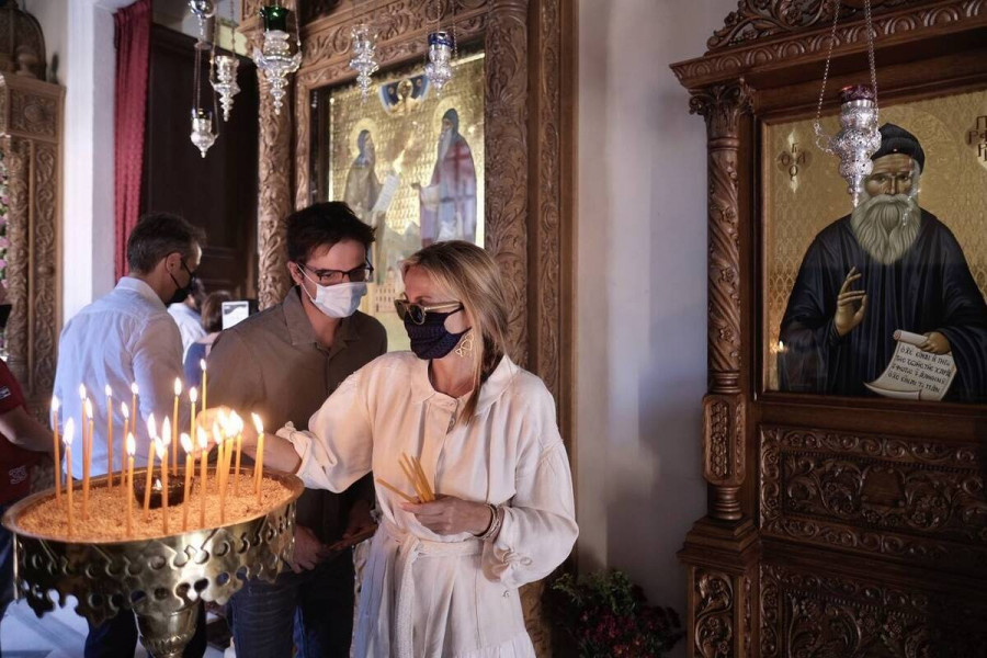 Στην Ιερά Μονή της Αγίας Τριάδας Τζαγκαρόλων στο Ακρωτήρι, βρέθηκε σήμερα ο πρωθυπουργός Κυριάκος Μητσοτάκης συνοδευόμενος από τη σύζυγό του Μαρέβα Γκραμπόφσκι - Μητσοτάκη και τον γιο τους Κωνσταντίνο, για την εορτή της Κοιμήσεως της Θεοτόκου.