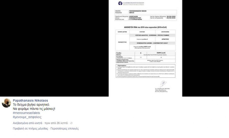 Ο κ. Παπαθανάσης έγραψε: «Το δείγμα βγήκε αρνητικό. Να φοράμε όλοι τις μάσκες μας, είναι θέμα ατομικής ευθύνης έναντι του κοινωνικού συνόλου. Το οφείλουμε στα παιδιά μας, στους γονείς μας, στους παππούδες και στις γιαγιάδες μας. Σώζουν ζωές!».