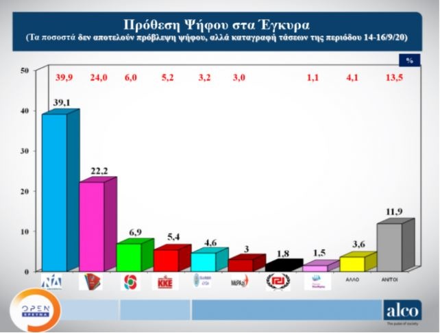 Δημοσκόπηση της «ALCO» για το OPEN που διενεργήθηκε το διάστημα 14 με 16 Σεπτεμβρίου, σε πανελλαδικό δείγμα 1.000 ατόμων δίνει προβάδισμα 16,9 μονάδων στη ΝΔ - Η γνώμη των πολιτών για ελληνοτουρκικά, οικονομία, κορονοϊό
