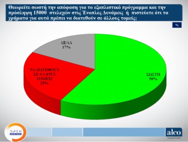 Για το εξοπλιστικά το 58% συμφωνεί ενώ σε περίπτωση νέας γεώτρησης της Τουρκίας σε ελληνικά ύδατα το 37% θέλει στρατιωτική λύση ενώ το 49% θέλει λύση μέσω διπλωματίας.
