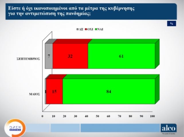 Το 61% των ερωτηθέντων δηλώνει ικανοποίηση από την αντιμετώπιση της πανδημίας από πλευράς της κυβέρνησης, έναντι αντίστοιχου ποσοστού 84% τον Μάιο.