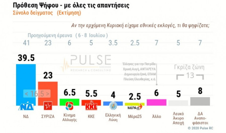 Στην πρόθεση ψήφου η διαφορά ΝΔ – ΣΥΡΙΖΑ διαμορφώνεται στο 16,5%, με τη ΝΔ να συγκεντρώνει 39,5% (έναντι 41,5% στην προηγούμενη σφυγμομέτρηση του Ιουλίου), και τον ΣΥΡΙΖΑ να παραμένει σταθερός (23%), με τα ποσοστά από τη μικρή δημοσκόπηση υποχώρηση του κυβερνώντος κόμματος να φαίνεται ότι τα καρπώνονται το Κίνημα Αλλαγής, το ΚΚΕ και η Ελληνική Λύση.
