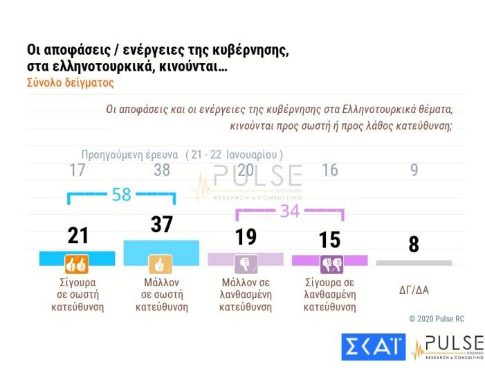 Οι αποφάσεις/ενέργειες της κυβέρνησης στα ελληνοτουρκικά κινούνται σε σωστή κατεύθυνση δηλώνει το 58% των ερωτηθέντων συνολικά, δηλαδή σίγουρα σε σωστή κατεύθυνση το 21% (έναντι 17% στην προηγούμενη δημοσκόπηση του Ιανουαρίου) ή μάλλον σε σωστή κατεύθυνση το 37% (έναντι 38%). Το 19% των ερωτώμενων (έναντι 20% στην προηγούμενη σφυγμομέτρηση) δηλώνει ότι οι αποφάσεις της κυβέρνησης στα ελληνοτουρκικά κινούνται μάλλον σε λάθος κατεύθυνση, ενώ το 15% (16%) δηλώνει ότι κινούνται σίγουρα σε λάθος κατεύθυνση. 8% δηλώνει δεν ξέρω/δεν απαντώ (9%).