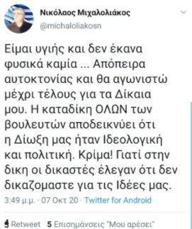 Λίγες ώρες μετά την ανακοίνωση της ιστορικής απόφασης o αρχηγός της Χρυσής Αυγής, Νίκος Μιχαλολιάκος έκανε μία ανάρτηση στο Twitter
