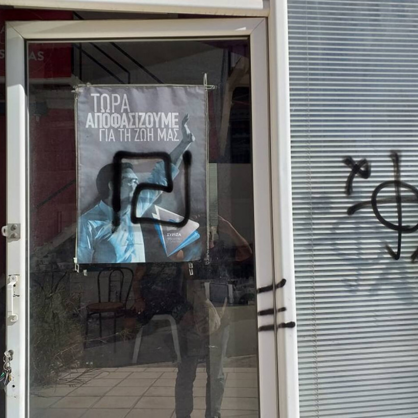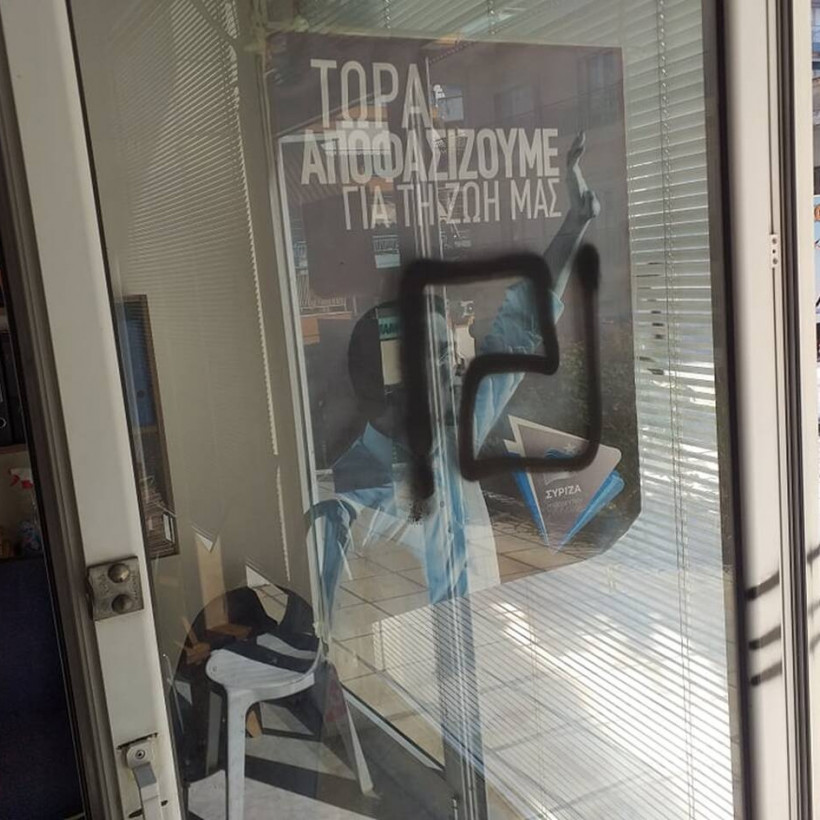 Καλυπτόμενοι από το σκοτάδι της νύχτας, όπως αρμόζει στους θρασύδειλους, σχεδίασαν το σήμα της οργάνωσής τους βρομίζοντας την τζαμαρία στην είσοδο των γραφείων. Για μια ακόμη φορά η απάντησή μας είναι πως δεν πρόκειται να μας φοβίσουν. Αντίθετα έτσι, δυναμώνουν τα δημοκρατικά και αντιφασιστικά μας αισθήματα, ώστε να συνεχίσουμε τον αγώνα μέχρις ότου και τα τελευταία ίχνη της συμμορίας αλλά και της εγκληματικής ιδεολογίας της, εξαφανιστούν από την ελληνική κοινωνία.