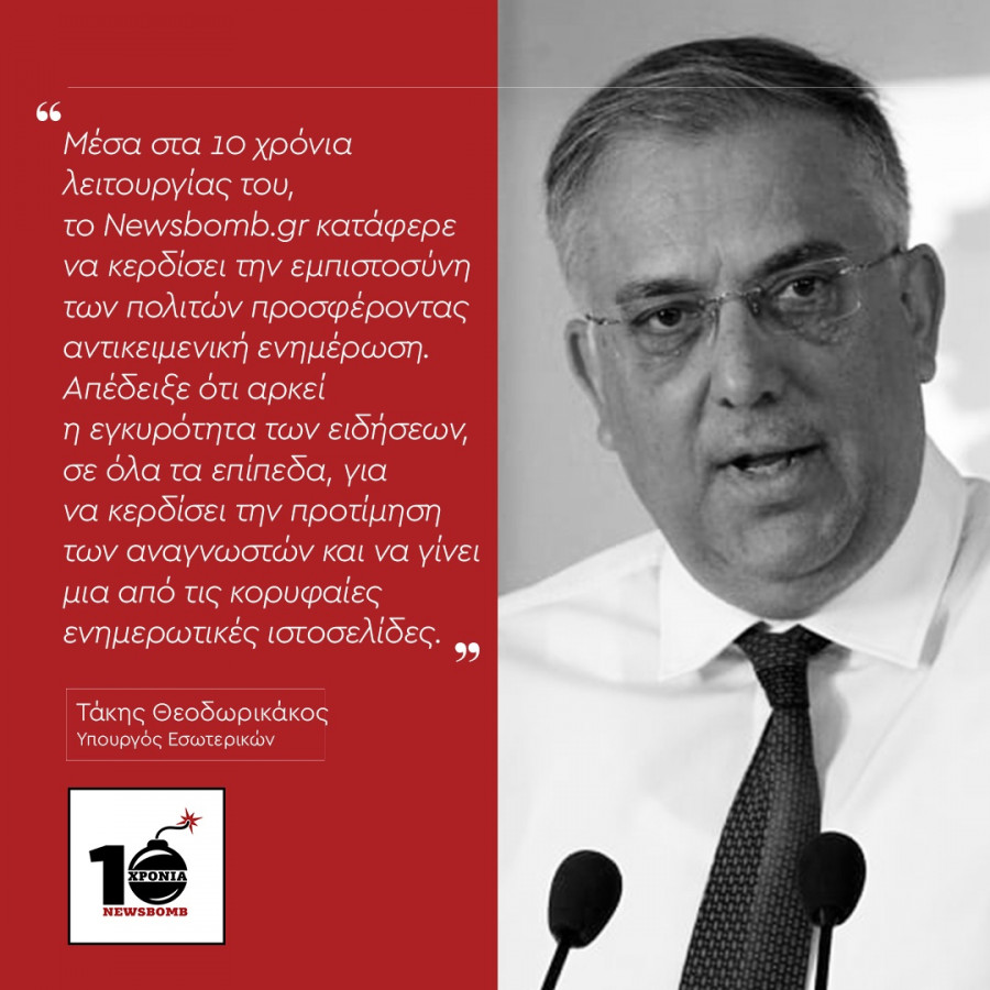 Δέκα χρόνια Newsbomb.gr: 2010 - 2020 / Πολιτικοί αρχηγοί, κορυφαίοι υπουργοί της κυβέρνησης και βουλευτές της αντιπολίτευσης εύχονται ολόψυχα στο Newsbomb.gr να συνεχίσει με την ίδια μαχητικότητα να πετάει βόμβες στο πολιτικό σύστημα - Το μήνυμα του Υπουργού Εσωτερικών, κ. Τάκη Θεοδωρικάκο.