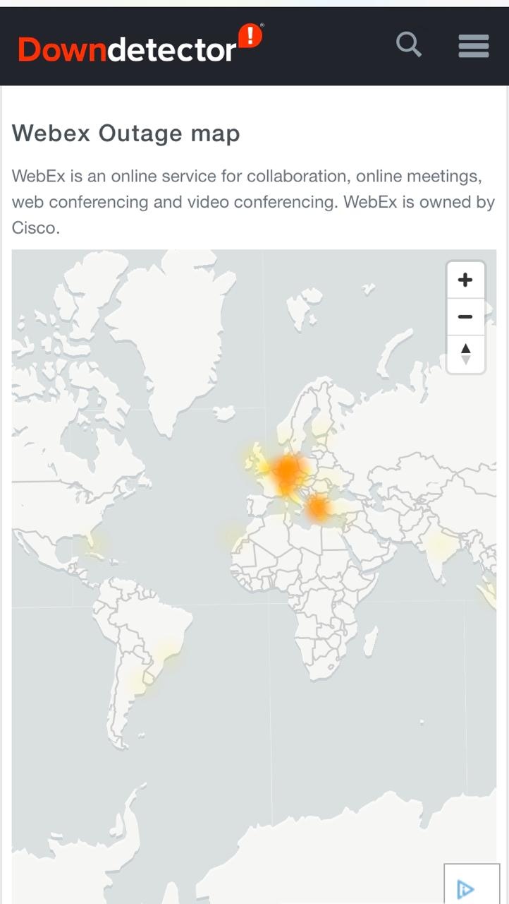 Στο παρατηρητήριο fake news της ΝΔ επισυνάπτονται επίσης ο χάρτης και τα επίσημα στοιχεία από το site καταγραφής προβλημάτων στις συνδέσεις Webex στην Ευρώπη, καθώς και ενδεικτικές αναφορές των χρηστών από διάφορες ευρωπαϊκές χώρες.