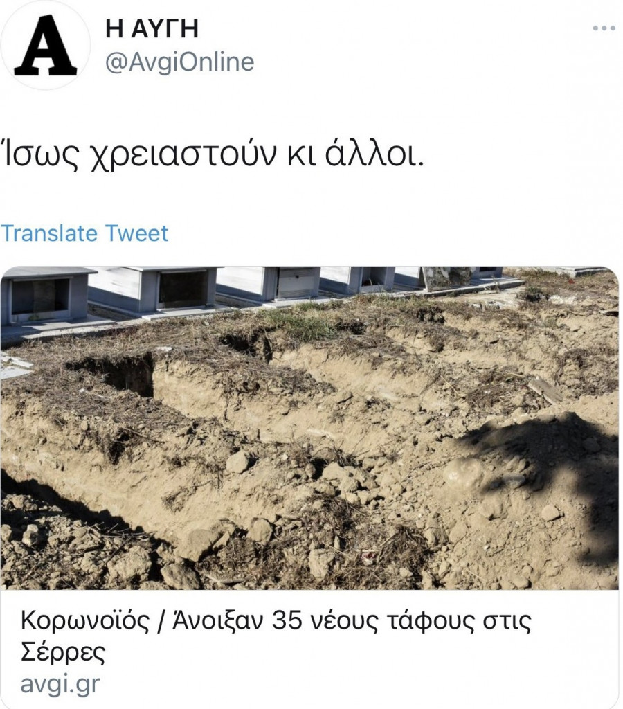 «Σήμερα η Αυγή ξεπέρασε τον εαυτό της. Σε αθλιότητα. Δεν σέβονται ούτε την αγωνία των ανθρώπων, ούτε τον πόνο τους μπροστά στον ίδιο τον θάνατο. Σαν πολιτικές ύαινες περιμένουν θύματα, μήπως και τραφούν πολιτικά. Η κοινωνία τους έχει γυρίσει την πλάτη, η Ιστορία θα τους καταγράψει στις μαύρες σελίδες της», αναφέρει η ΝΔ.