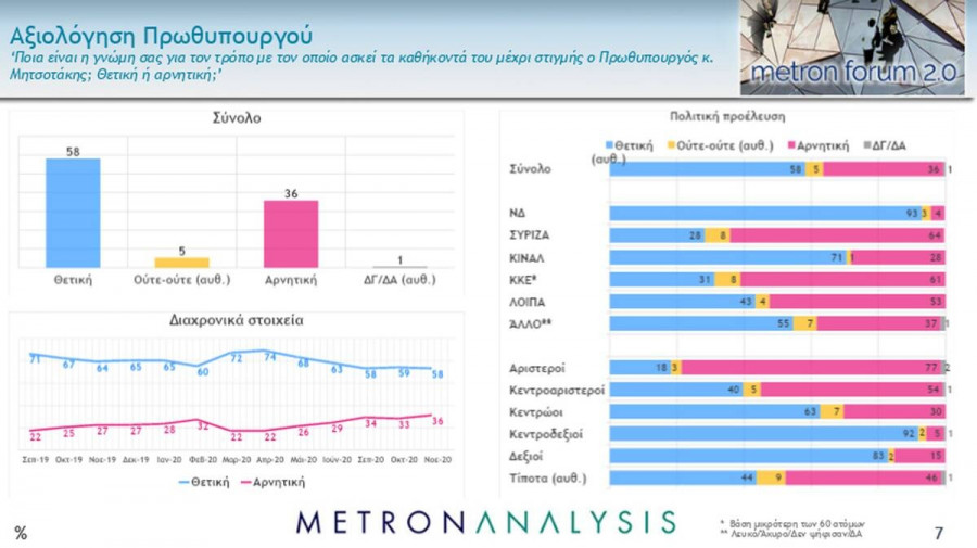 Στην αξιολόγηση του πρωθυπουργού Κυριάκου Μητσοτάκη θετικά εκφράζεται το 58% , αρνητικά το 36% και ούτε θετικά, ούτε αρνητικά το 5%. Θετικά εκφράζονται οι ψηφοφόροι της ΝΔ σε ποσοστό 93% και του ΚΙΝΑΛ με 70% ενώ αντίθετα αρνητική γνώμη έχουν οι ψηφοφόροι του ΣΥΡΙΖΑ με 63,8%, του ΚΚΕ με 61% και των άλλων κομμάτων με 52,5%.