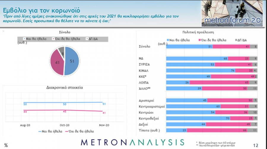 Οι ψηφοφόροι του ΚΙΝΑΛ θα έκαναν το εμβόλιο κατά 75%, της ΝΔ κατά 67,7, του ΣΥΡΙΖΑ κατά 53,4%, του ΚΚΕ κατά 49% και τα άλλα κόμματα μόλις κατά 25%.