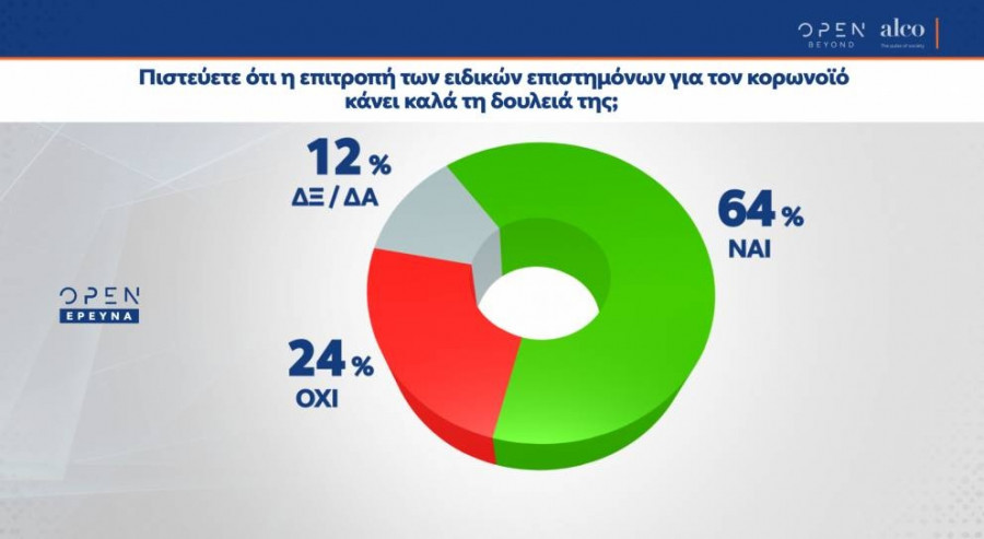 Η ικανοποίηση από την Επιτροπή των Ειδικών που διαχειρίζεται την υγειονομική πορεία της πανδημίας φθάνει το 64%, ενώ 24% δεν είναι ικανοποιημένοι.