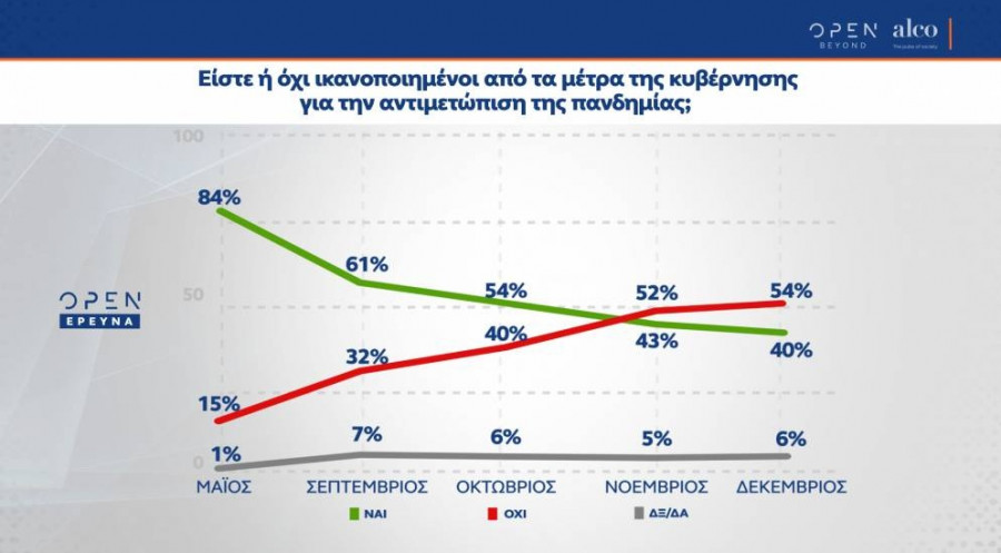 Το 54% των ερωτηθέντων δηλώνουν όχι ικανοποιημένοι από τη διαχείριση της πανδημίας από την κυβέρνηση, ενώ 40% εγκρίνουν την έως τώρα κυβερνητική διαχείριση.